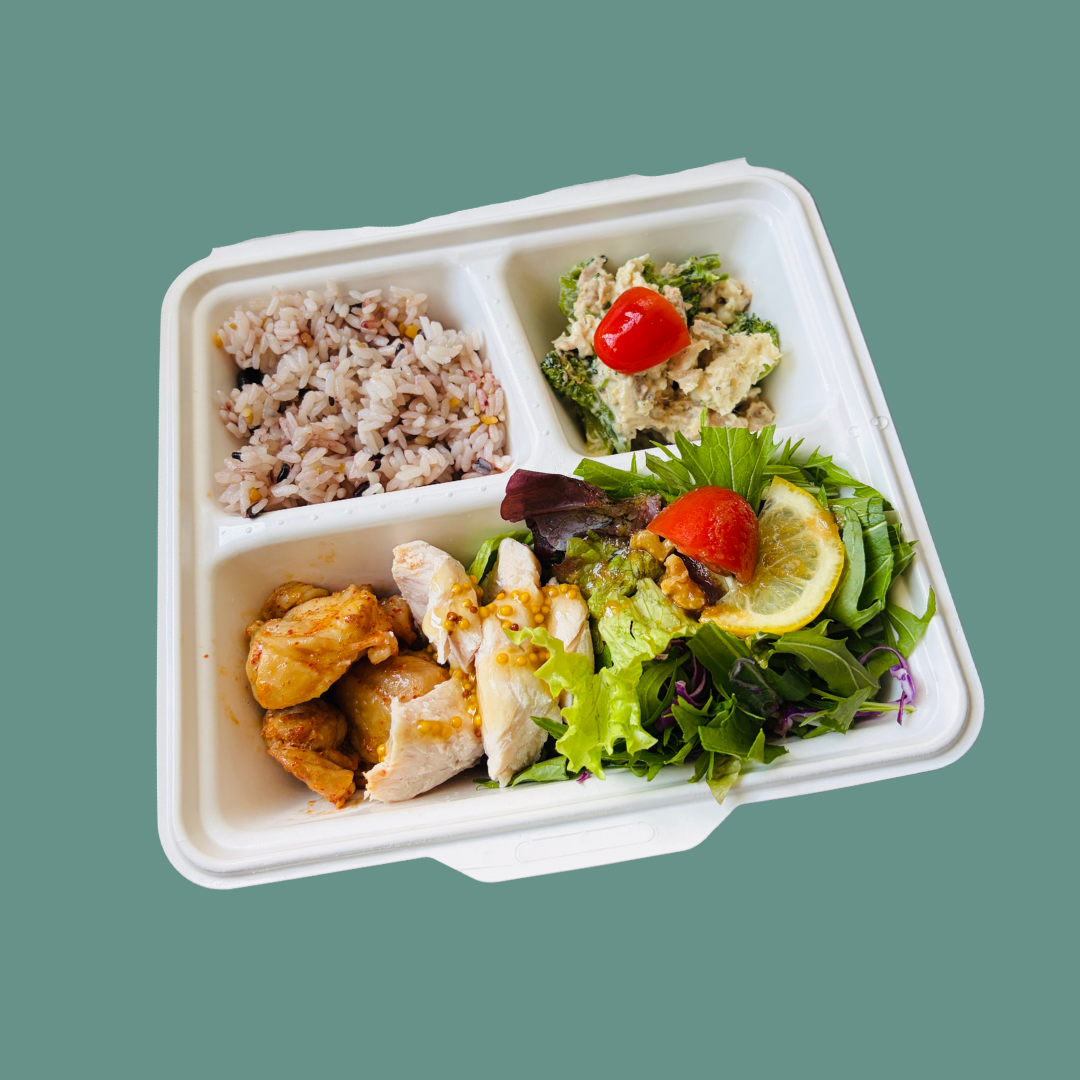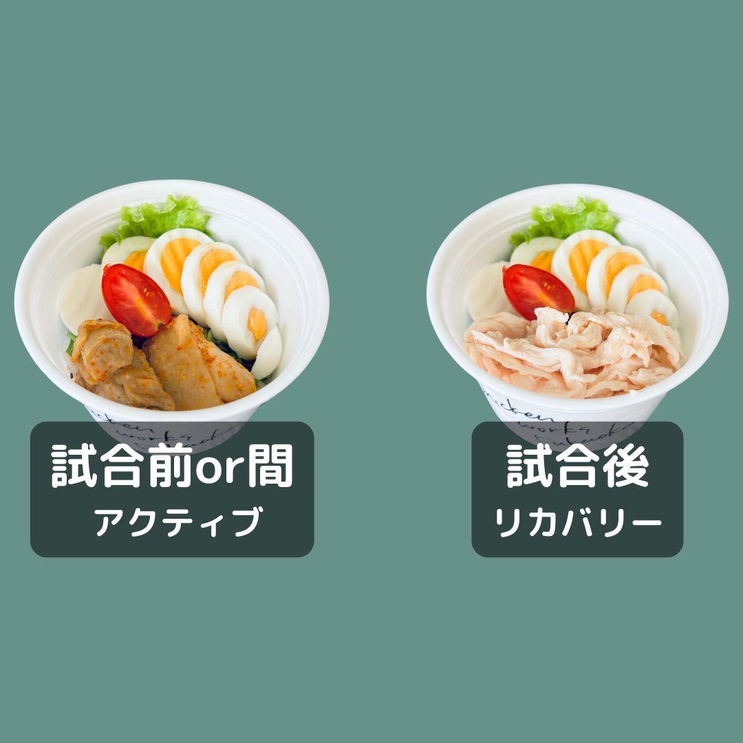 レギュラーサイズのチキンボウルより少なめのチキン50gに雑穀米100g、そして、ゆで卵とサラダのミニボウル